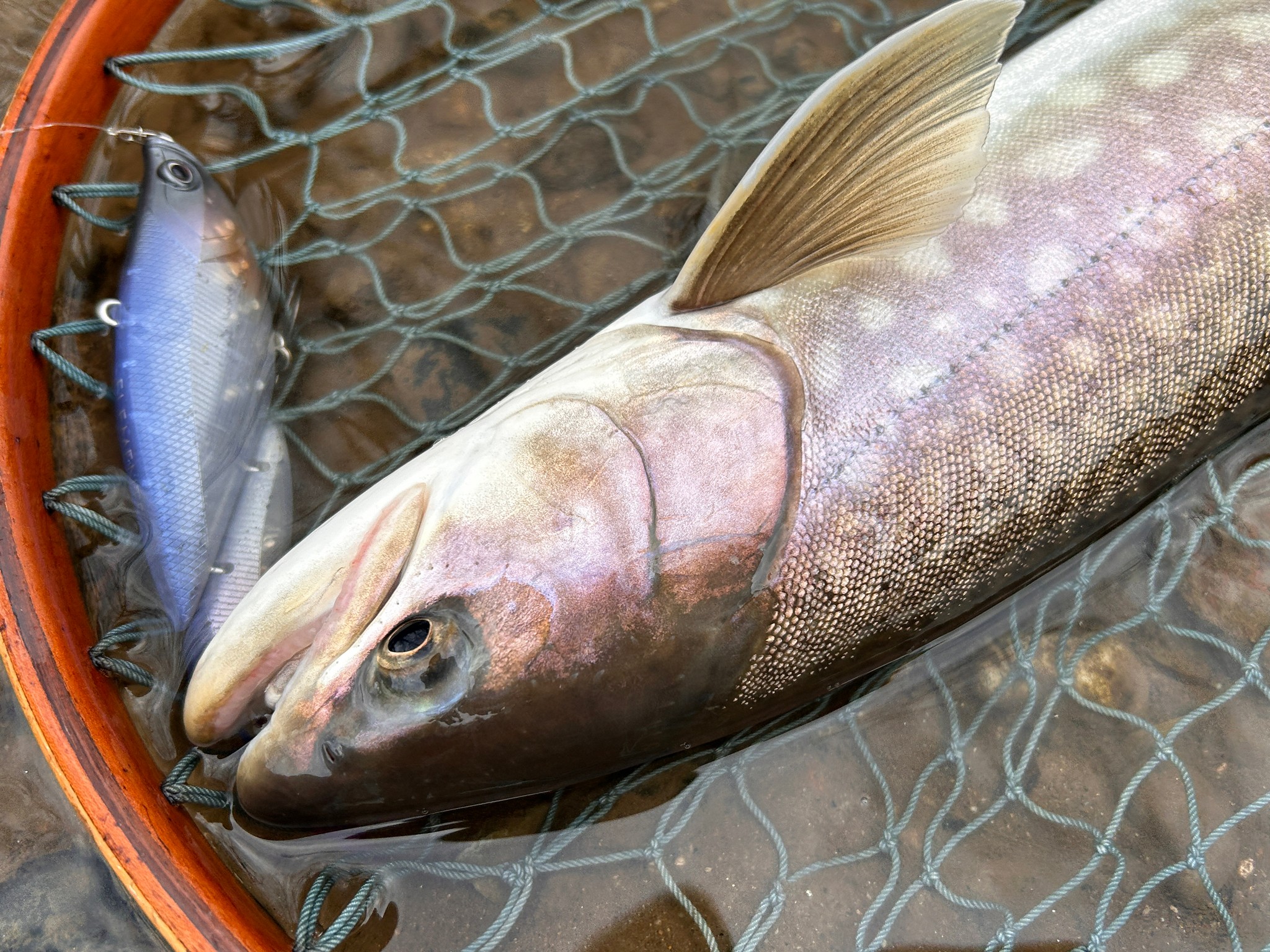 ストップ&ゴーで止めた瞬間に深みからヌルッとアメマスが…!ローワー73Lがアメマスの強烈なヘッドシェイクにしっかり追従してくれるので難なくキャッチ。ランディングしたのは70cmクラスの良型。