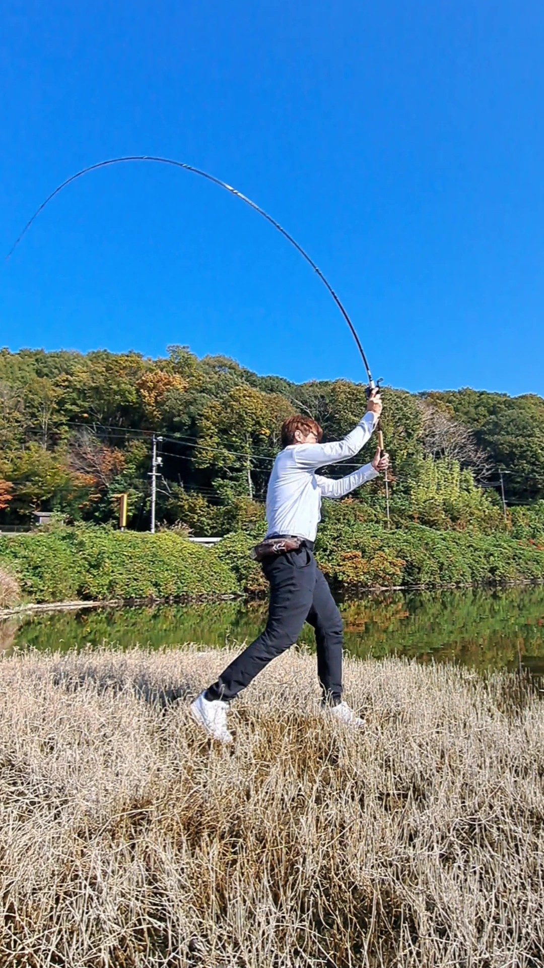 次に暗がりに入った瞬間、「コン…グッ…」と、最初は小さくバイトして、そして一瞬の後、生命感強く、それは動いた。咄嗟にハンドルを回して巻き合わせを入れる。ズンっ!と一気にバットまで曲がった。