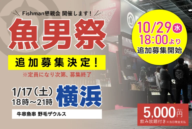 <blockquote class="wp-embedded-content" data-secret="RPMp7wOgzX"><a href="https://www.fish-man.com/251029_info/">【魚男祭in横浜】参加者募集開始!</a></blockquote><iframe sandbox="allow-scripts" security="restricted" src="https://www.fish-man.com/251029_info/embed/#?secret=RPMp7wOgzX" width="600" height="400" title="“【魚男祭in横浜】参加者募集開始!” — Fishman(フィッシュマン)" data-secret="RPMp7wOgzX" frameborder="0" marginwidth="0" marginheight="0" scrolling="no" class="wp-embedded-content"></iframe><script type="text/javascript"> /* <![CDATA[ */ /*! This file is auto-generated */ !function(d,l){"use strict";l.querySelector&&d.addEventListener&&"undefined"!=typeof URL&&(d.wp=d.wp||{},d.wp.receiveEmbedMessage||(d.wp.receiveEmbedMessage=function(e){var t=e.data;if((t||t.secret||t.message||t.value)&&!/[^a-zA-Z0-9]/.test(t.secret)){for(var s,r,n,a=l.querySelectorAll('iframe[data-secret="'+t.secret+'"]'),o=l.querySelectorAll('blockquote[data-secret="'+t.secret+'"]'),c=new RegExp("^https?:$","i"),i=0;i<o.length;i++)o[i].style.display="none";for(i=0;i<a.length;i++)s=a[i],e.source===s.contentWindow&&(s.removeAttribute("style"),"height"===t.message?(1e3<(r=parseInt(t.value,10))?r=1e3:~~r<200&&(r=200),s.height=r):"link"===t.message&&(r=new URL(s.getAttribute("src")),n=new URL(t.value),c.test(n.protocol))&&n.host===r.host&&l.activeElement===s&&(d.top.location.href=t.value))}},d.addEventListener("message",d.wp.receiveEmbedMessage,!1),l.addEventListener("DOMContentLoaded",function(){for(var e,t,s=l.querySelectorAll("iframe.wp-embedded-content"),r=0;r<s.length;r++)(t=(e=s[r]).getAttribute("data-secret"))||(t=Math.random().toString(36).substring(2,12),e.src+="#?secret="+t,e.setAttribute("data-secret",t)),e.contentWindow.postMessage({message:"ready",secret:t},"*")},!1)))}(window,document); /* ]]> */ </script>